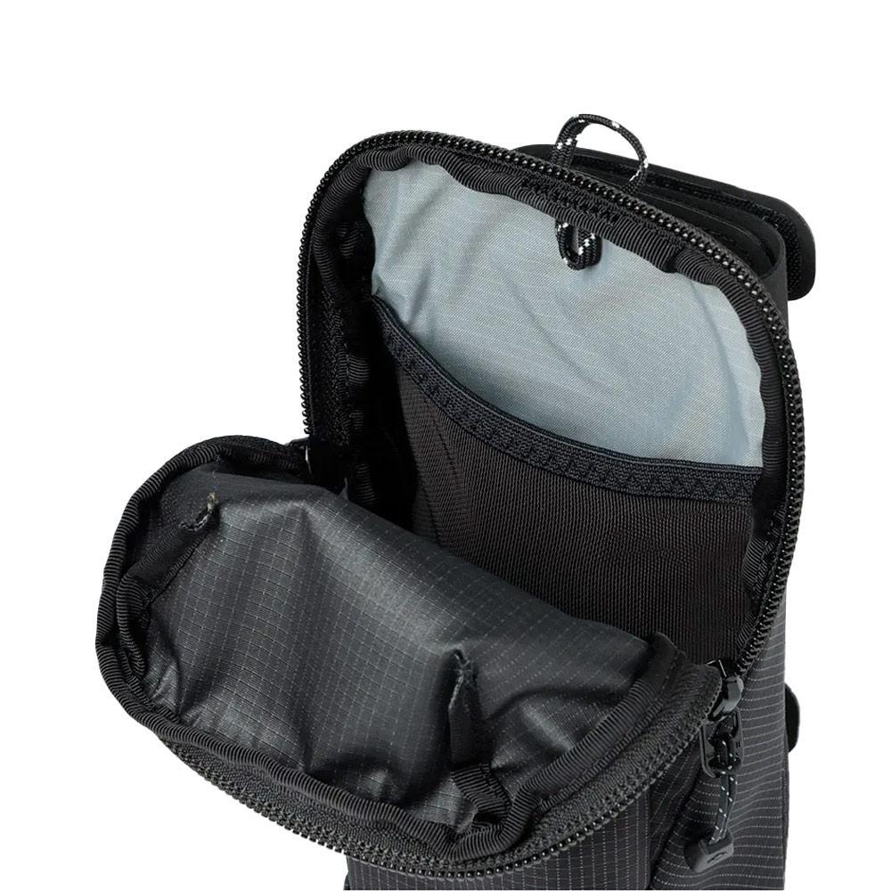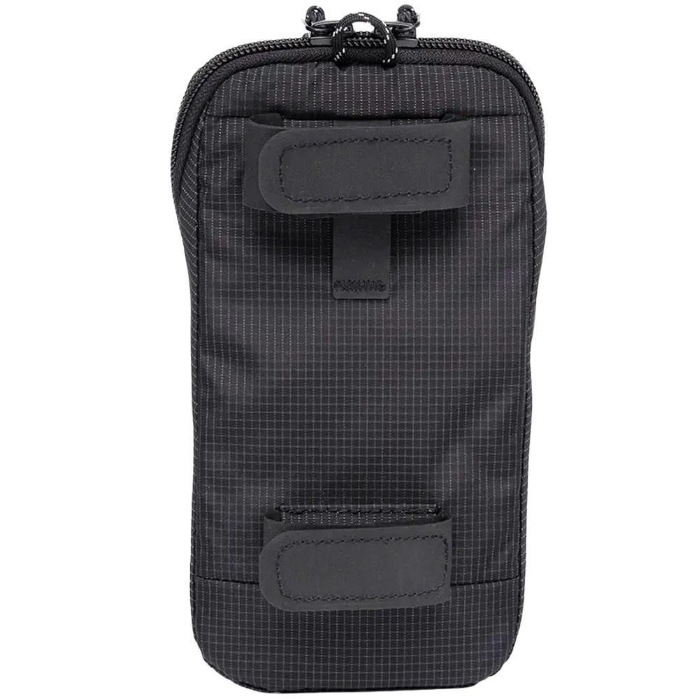 Attaches to the shoulder strap of a backpack while holding a smartphone along with other small items. Two rear hook-and-loop straps keep the pouch in place during active movements and detach for compatibility with belts, backpack hipbelts, hooks, and other objects.